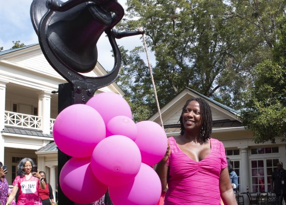 Outfitted in various hues of pink, survivors, fighters, and friends grabbed the pink pompoms placed at each of their seats, lined the pathway in the back of the building leading to a bell, and cheered the first-time bell ringers to the groove of “I’m Coming Out” by Diana Ross.