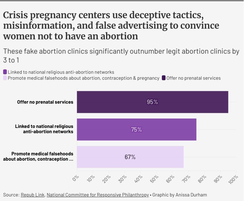 “Many of these centers have tried to shame people into continuing pregnancies, even when they want an abortion,” McDonald-Mosely says. “And they give a lot of wrong information about the risks of abortion, which has led people to delay care or not receive care at all.”